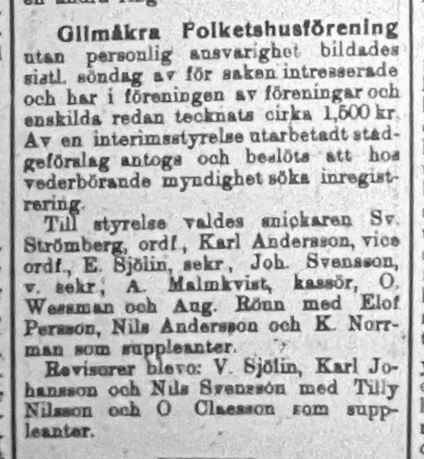 Andelsföreningen Glimåkra Folketshusförening u.p.a höll årsmöte söndagen den 14 juli 1912 och fick sin första styrelse med Sven Strömberg som förste ordförande. Det betyder att föreningen tillhör en av de äldre folketshusföreningarna i landet.